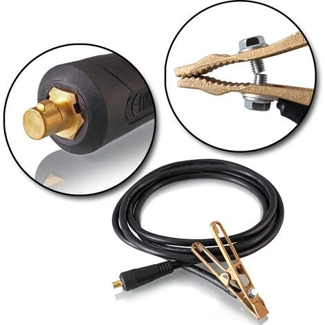 Le câble de soudure de terre mesure 3 mètres de long et est équipé d’une fiche et d’une borne de terre. Le câble a une capacité de transport de courant allant jusqu’à 260 A. La borne de terre est équipée d’une tresse en cuivre et de solides mâchoires de serrage. Cela garantit toujours un flux de courant optimal.