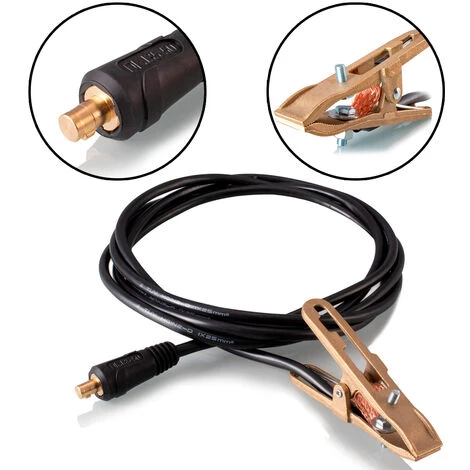 - Le câble de soudure de terre mesure 3 mètres de long et est équipé d’une fiche et d’une borne de terre.