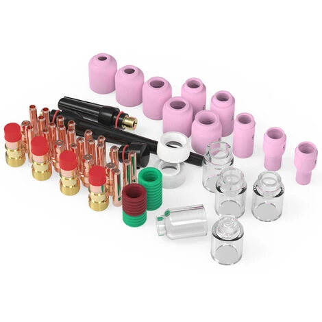 Contient 68 pièces, y compris des capuchons arrière, une lentille à gaz, des pinces de torche, des buses à gaz en céramique, des tasses en verre, etc.